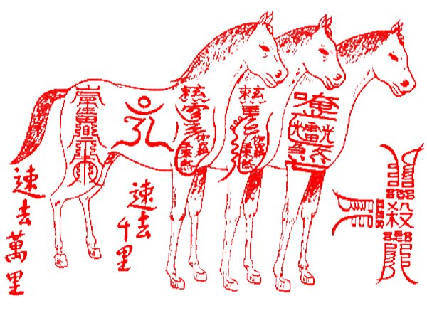 사주나 심령에 따라 서방 백제 신장과 서방 백제 장군님의 책임소재로 살풀이를 하고자 할 때에는 말머리가 서방으로 향한 이 부적을 사용하면